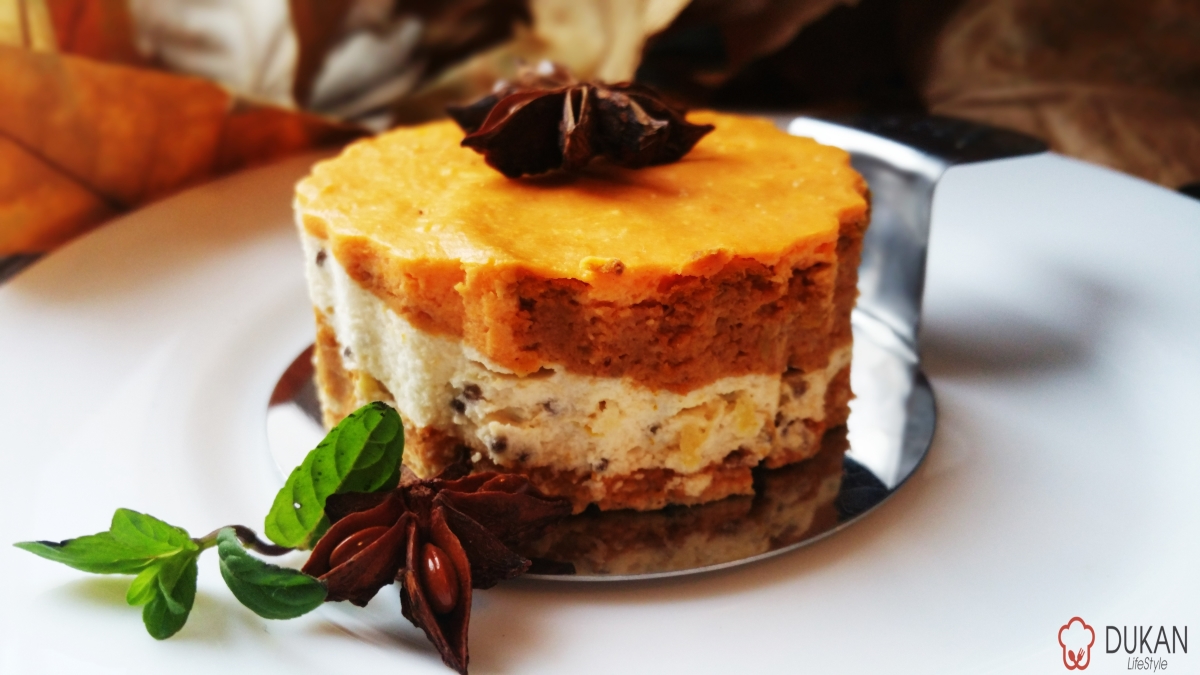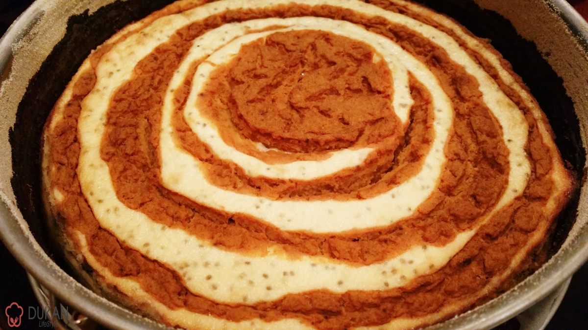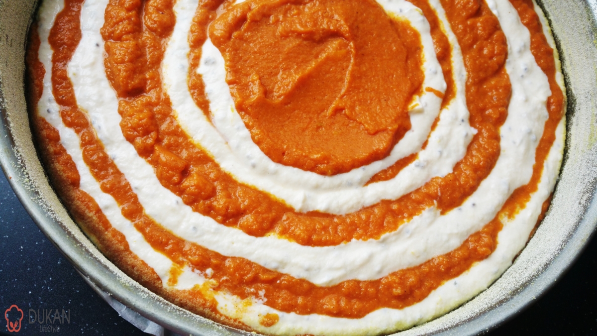 Amestecam cele 100 grame piure de dovleac pe care le-am oprit, cu iaurtul grecesc, indulcitorul, un ou si aromam dupa preferinta (vanile). Turnam peste tarta.