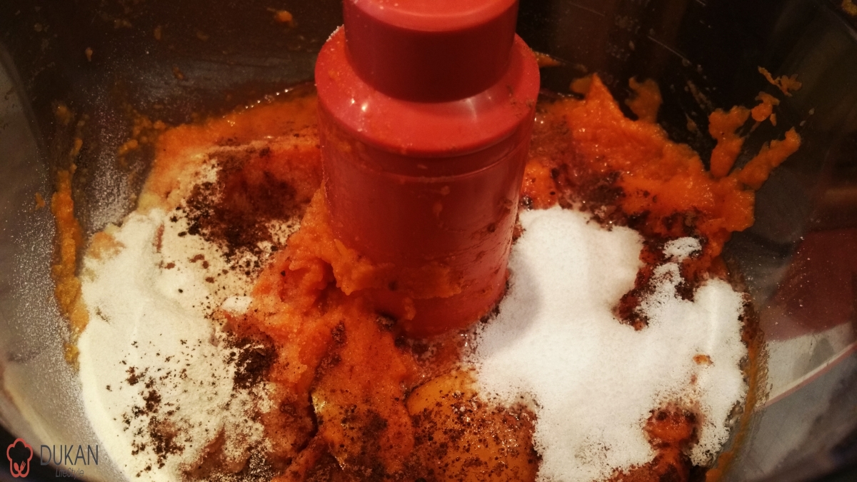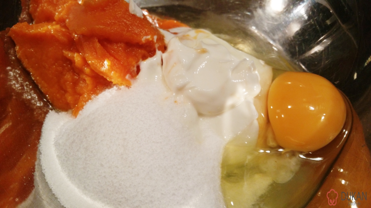 Peste dovleacul ramas adaugam 3 oua, indulcitor dupa gust, scortisoara, anason si 20 grame (2 linguri) gris, blendam putin pana la omogenizare.