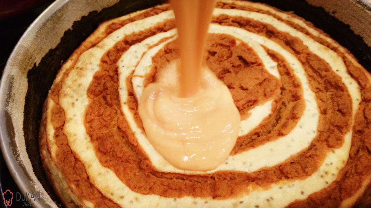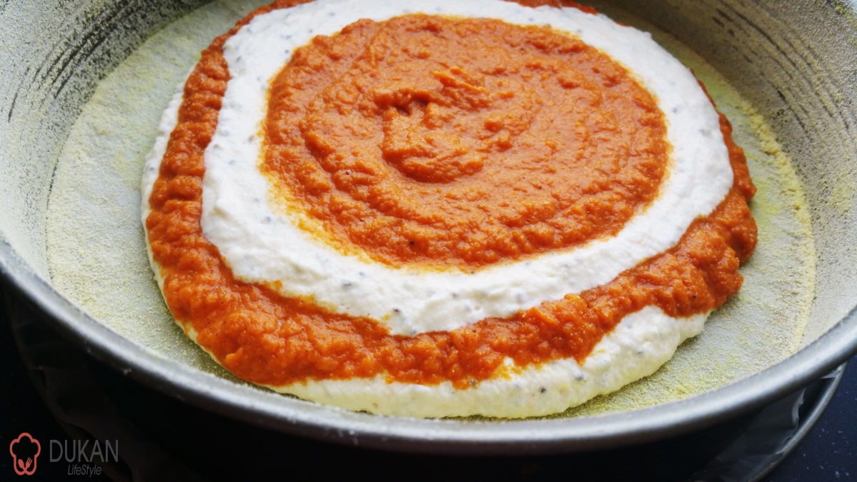 Cele doua compozitii trebuie sa aiba aproximativ aceeasi consistenta. Intrucat grisul NoCarb leaga si intareste, peste compozitia de branza, pentru ca vom observa ca este mai tare, adaugam 100 ml. lapte semi-degresat (1,5%) si subtiem amestecand.