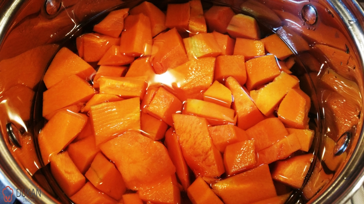 Dovleacul curatat si taiat cuburi il fierbem cca. 10 min. si il lasam la scurs intr-o sita.