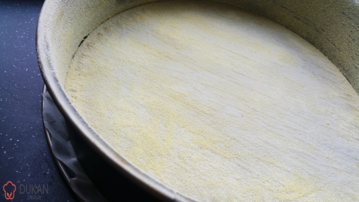 O forma rotunda cu baza detasabila (sau orice alta tava doriti) o tapetam cu hartie de copt. Eu am uns-o apoi cu ulei de nuca de cocos si am pudrat-o cu putin Pesmet fara carbohidrati-NoCarb.